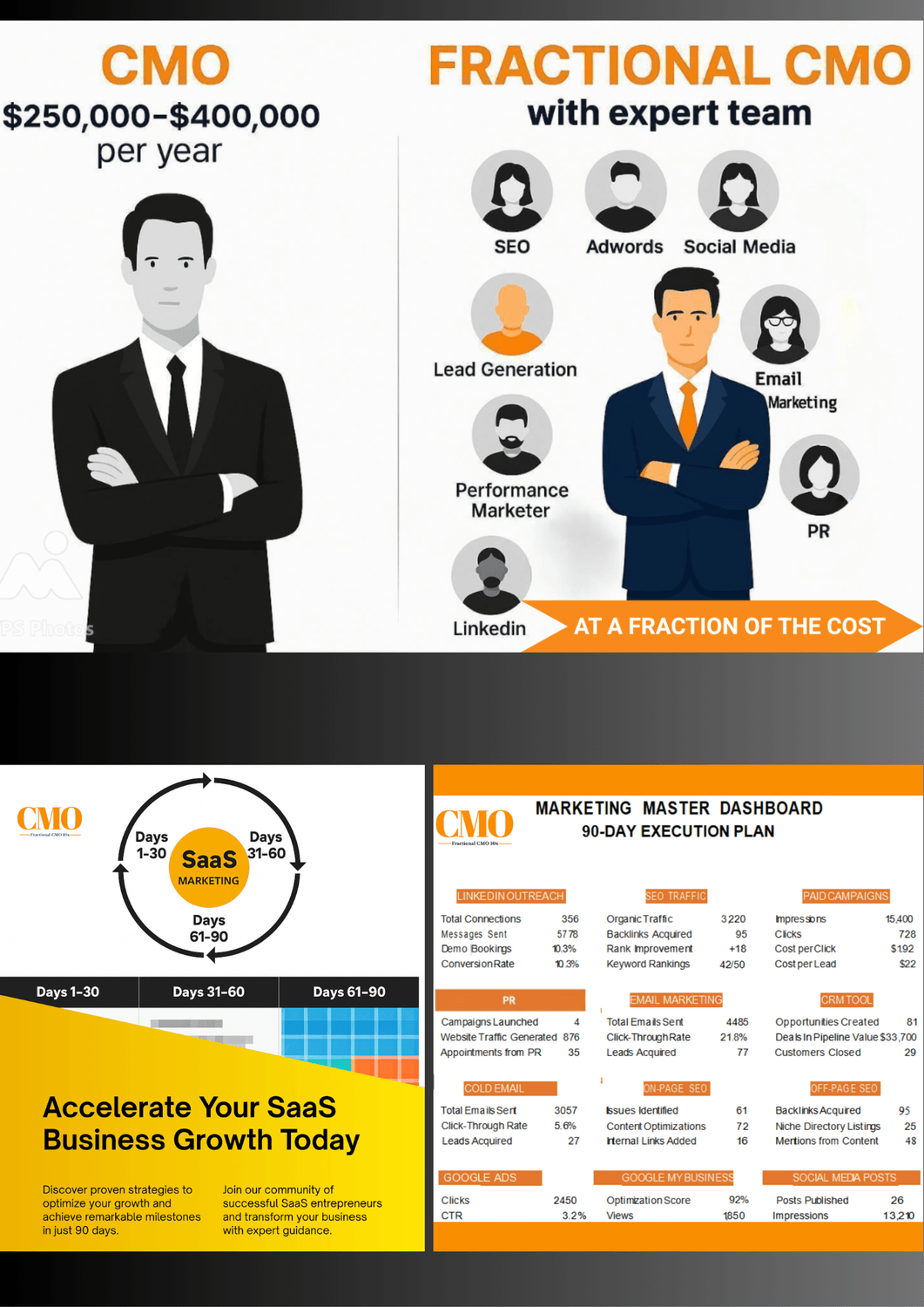 Work directly with a seasoned SaaS Fractional CMO who co-owns your growth goals — bringing the leadership, accountability, and team execution you need to scale in just 90 days.