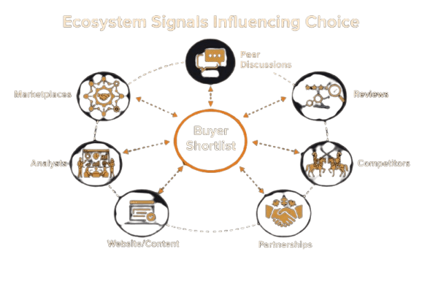 Peer recommendations, analyst mentions, partner ecosystems, and marketplace presence decide who gets seriously considered. If you are not visible across those surfaces early, the demo is a formality.